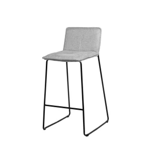Taburete ABOT es un taburete alto tapizado con respaldo cómodo y patas metálicas negras, perfecto para acompañar barras de cocina y mesas altas.