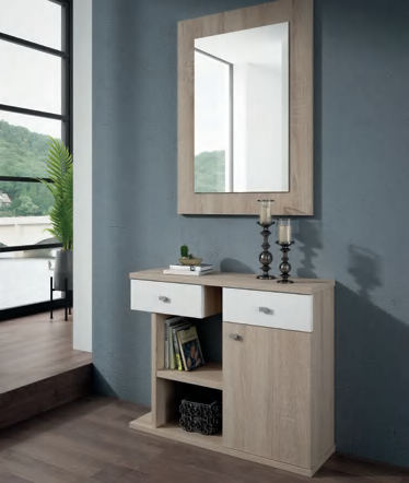 - Composición: consola con puertas y huecos abiertos para decorar, más espejo con marco en madera.