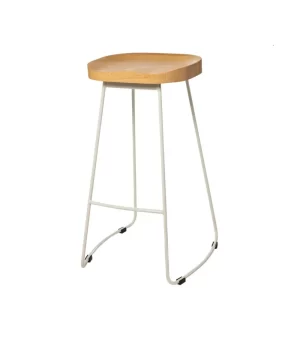 Joel es un taburete alto con asiento de efecto madera y estructura metálica, perfecto para barras de estilo industrial.