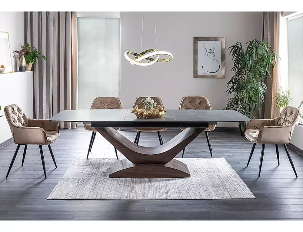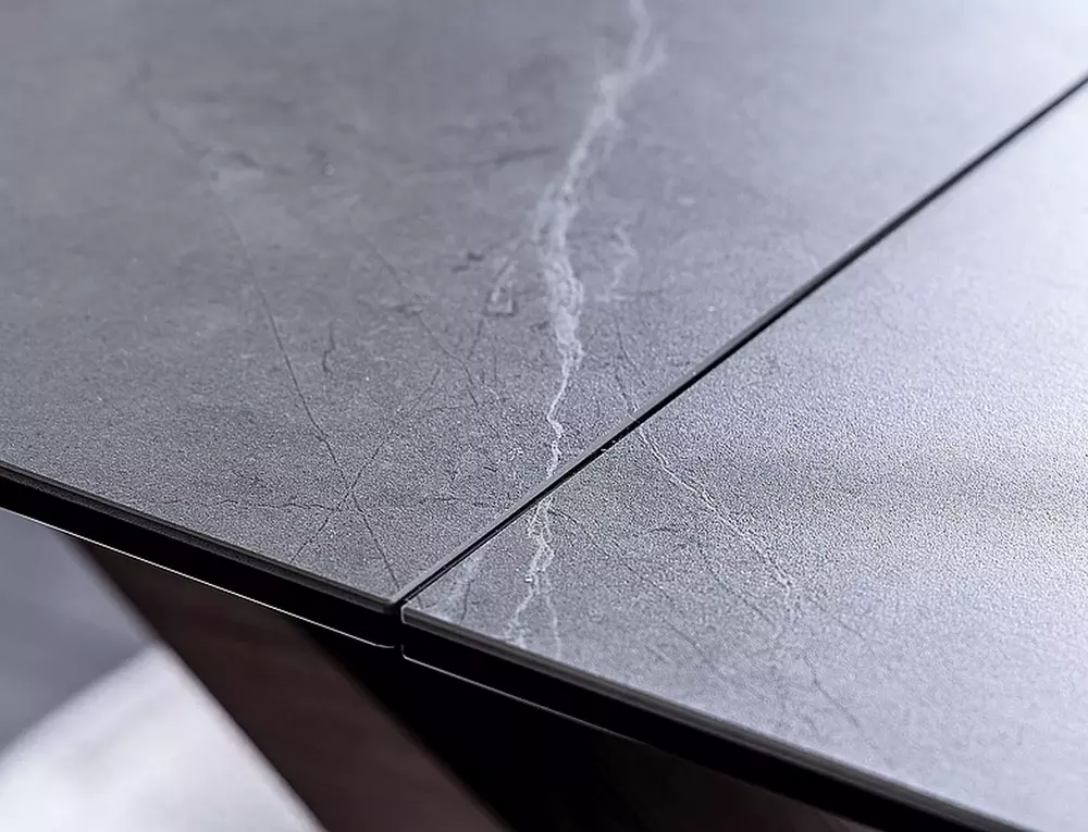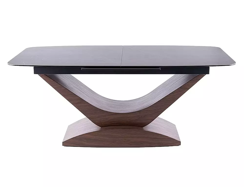 Mesa de comedor Dolce Ceramic — una combinación elegante de cerámica italiana y diseño contemporáneo. El tablero está fabricado en vidrio templado con cerámica italiana, lo que lo hace resistente a los arañazos, la humedad y las altas temperaturas. La base geométrica de MDF con chapa natural aporta sofisticación y estilo al interior.